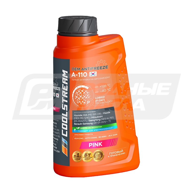 Coolstream A-110 - фосфатный лобридный антифриз (P-OAT), используемый для заправки в новые автомобили на заводах Hyundai и KIA по всему миру. Специально разработан под технические требования Hyundai-KIA, обладает официальным допуском Hyundai, KIA MS 591-08. Новая розовая версия антифриза является, по сути, улучшенной формулой на замену темно-зеленому A-110. Смешение с предыдущей версией антифриза допускается только в пропорциях не более 20% зеленого к 80% розового. Рекомендуется полная замена на новую версию для автомобилей Hyundai / KIA любого года выпуска.